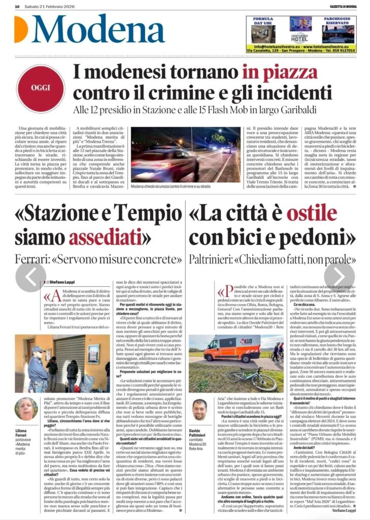 Modena, 18 Febbraio 2026 – Le associazioni della campagna Modena30 e la rete ARIA chiamano a raccolta tutta la cittadinanza per Sabato 21 Febbraio 2026, con un momento culminante alle ore 15:00 in Largo Garibaldi, all’incrocio con Viale Trento Trieste.