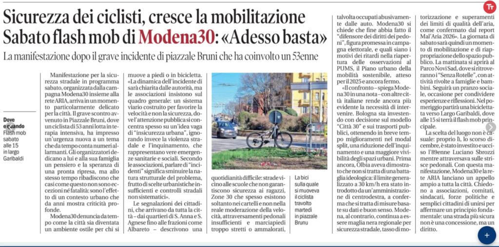 Indipendentemente dalla dinamica specifica della collisione — che sarà accertata dalle autorità — e dalle criticità già denunciate riguardo al cantiere dell’ex Cinema Principe, un fatto è inoppugnabile: Modena è diventata un ambiente urbano che punisce, spesso gravemente, chi sceglie di muoversi a piedi o in bicicletta.